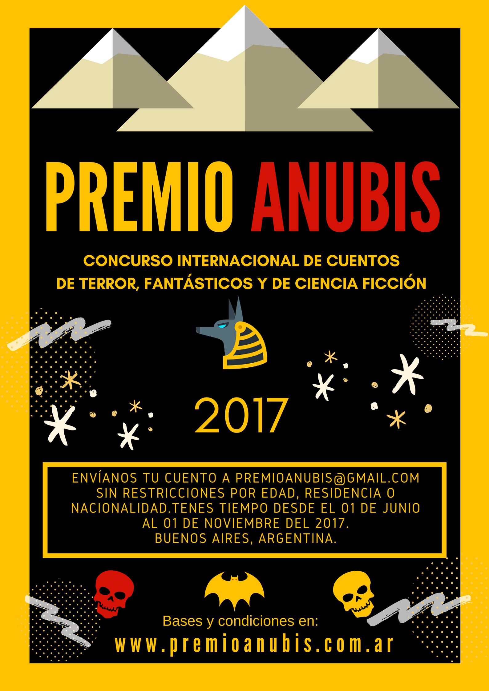 El plazo de admisión de las obras estará abierto desde el 01 de JUNIO y cerrará el 01 de NOVIEMBRE de 2017. La mera presentación de las obras implica la aceptación por parte de los participantes de los términos y condiciones de la presente convocatoria. Una vez concluido el concurso, los organizadores procederán a eliminar todos los archivos de las obras que no resulten premiadas y/o recomendadas para su publicación. Para cualquier duda o consulta sobre la interpretación de las bases, los participantes deben escribir a premioanubis@gmail.com La antología a publicarse será digital y para descarga gratuita, sin fines de lucro. Se elaborará una portada especial para la antología y se la maquetará en formato digital PDF. La antología se publicará durante el 2018.