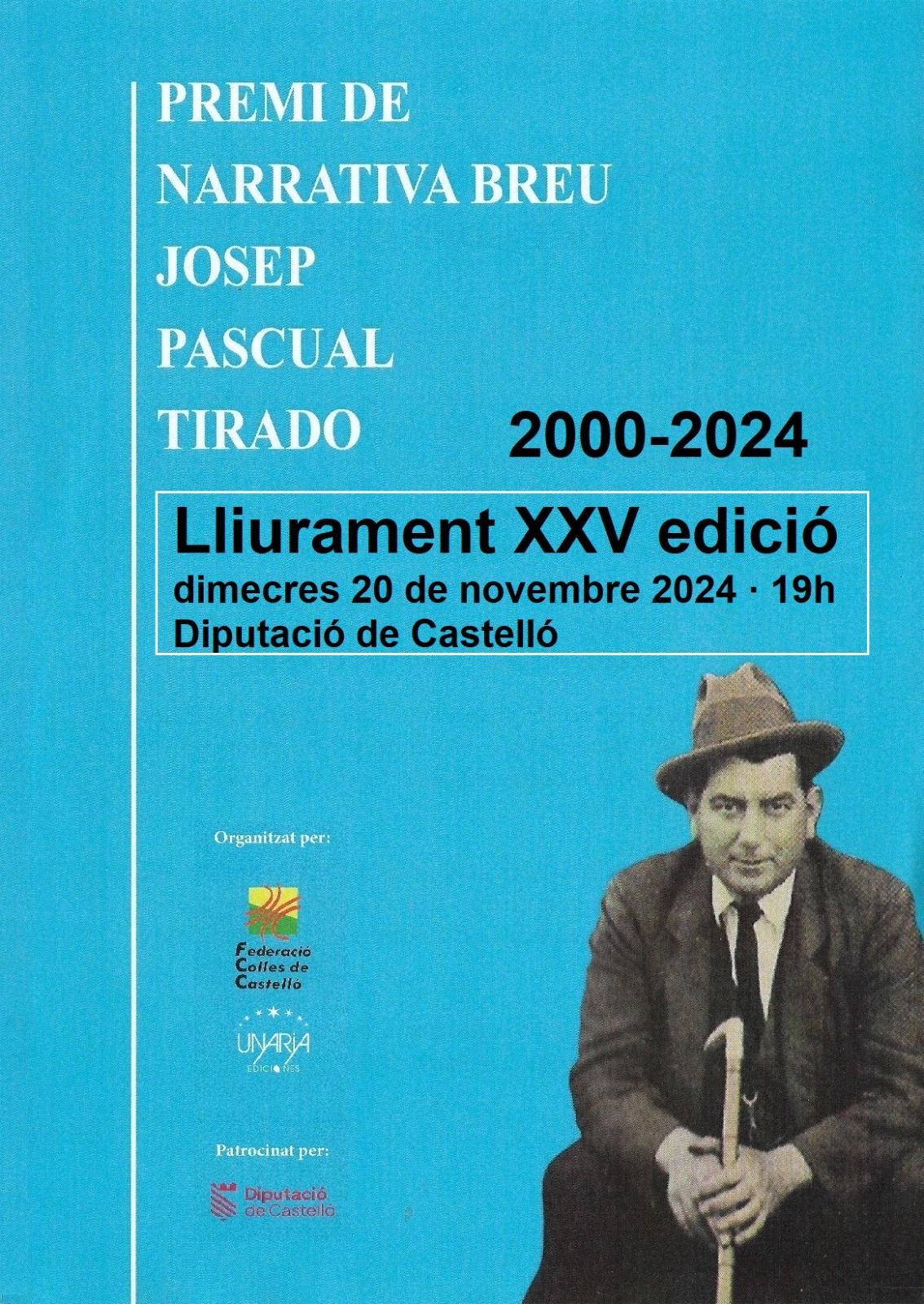 La Federació Colles de Castelló i Unaria Ediciones amb l’objecte de promoure la figura de l’escriptor Josep Pascual Tirado, a més de contribuir al desenvolupament i promoció de la literatura valenciana, organitzen, comptant amb el patrocini de l’Excel·lentíssima Diputació de Castelló, la XXV Edició del Premi de Narrativa Breu “Josep Pascual Tirado”, per a relats escrits en valencià, d’acord amb les següents bases: